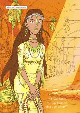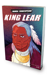 This manga version of King Lear is set during the era of The Last of the Mohicans – circa 1759, during a crucial era of invasion and displacement along the American frontier. Lear is a venerated Mohican (Iroquois) chieftain, entering his final days. His elder daughters Regan and Goneril – the evil pairing– are more westernised in their looks. Lear’s youngest daughter, Cordelia, with her Native American