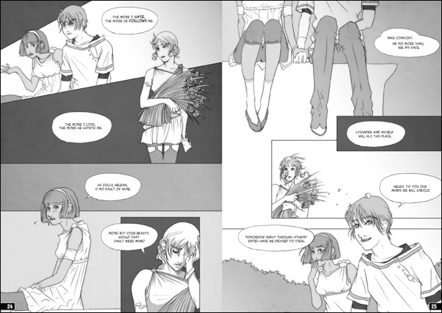 The style here has a lovely, clear and delicate use of line, with a distinct Art Nouveau feel, as well as manga influences. The way that [the characters] are drawn is often very touching, giving the reader a sense of their youth, vulnerability and awkwardness. Their emotions, shown in very varied facial expressions, are also well realized throughout and there is a great sense of movement in the images.