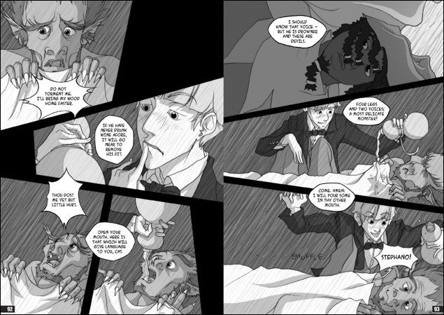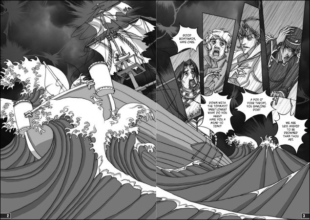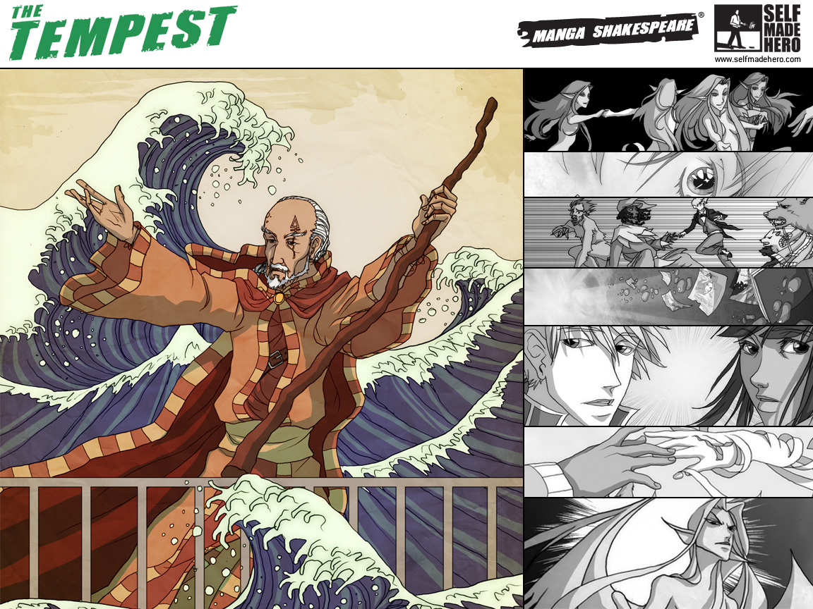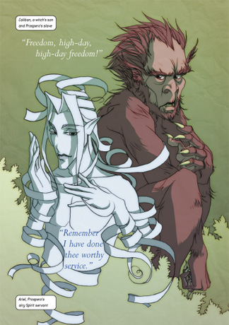 The drawing employs sweeping and dramatic lines and the initial color pages establish the overall atmosphere well. As with the characterization, the geography of the island is well realized and the map outlines both space and journeys, so helping to frame what happens in the play."